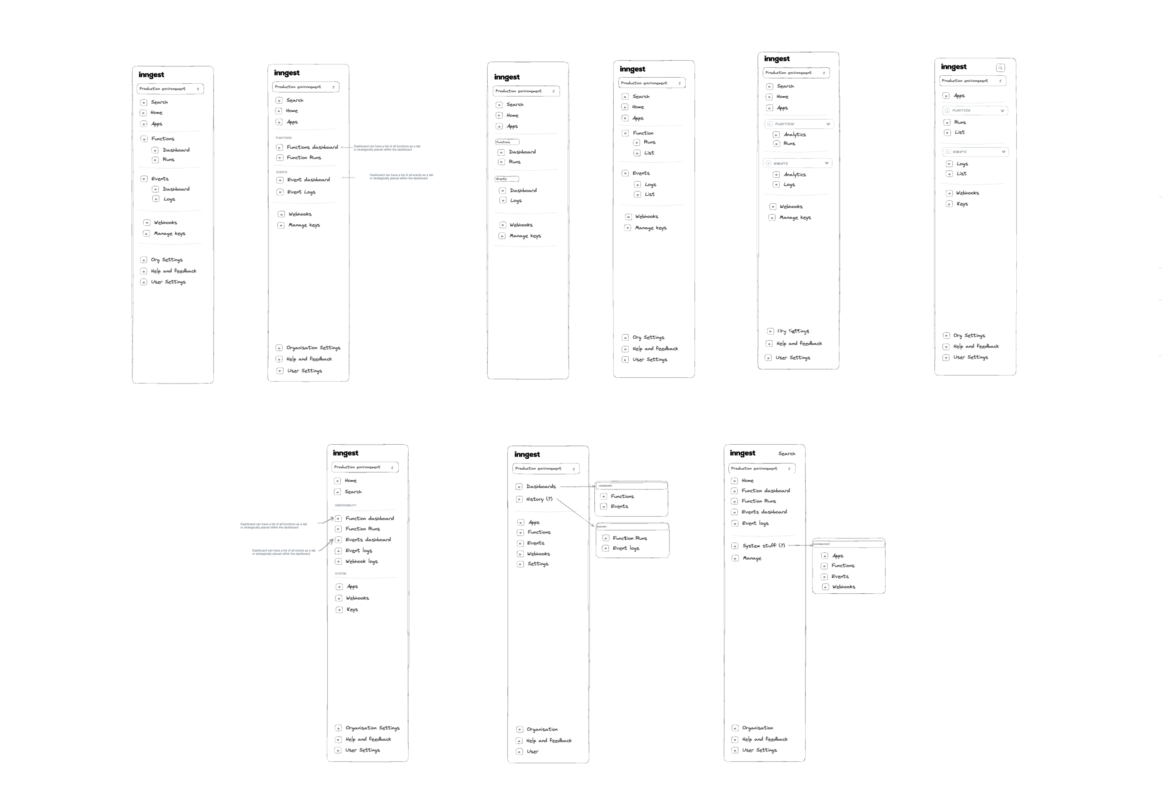 Information Architecture was a common source of pain for our users. Sometimes it was brought up explicitly, and sometimes implicitly. Some examples: Users were having difficulty navigating and finding specific parts of the Cloud Application, such as Webhooks. Understanding environments was a common friction point. And Users gave feedback on how inefficient locating specific functions and runs was. That being said, the common theme was easy to see: our IA needed a reimagining. Inngest's Design team had conversations with our users in order to dig deeper into the problem and learn more. In the process, we established the following goals to guide our redesign of Inngest's Information Architecture: